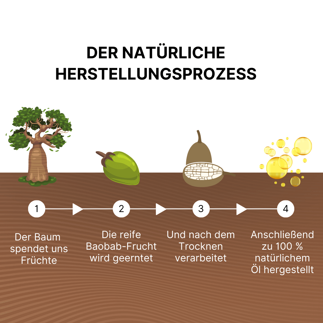 Die starke, feste Außenhülle der Baobab-Frucht ist ca. 2 bis 3mm dick. In Handarbeit werden die Schalen und Fasern von den aufgebrochenen Früchten getrennt und das Fruchtfleisch mit Samen weiterverarbeitet. Das Fruchtinnere wird mit einer Maschine zerkleinert; somit können die Samen vom Fruchtfleisch getrennt und kaltgepresst werden. Das daraus gewonnene Öl wird durch einen sehr feinen Stoff von Hand gefiltert und danach nicht mehr weiter behandelt.