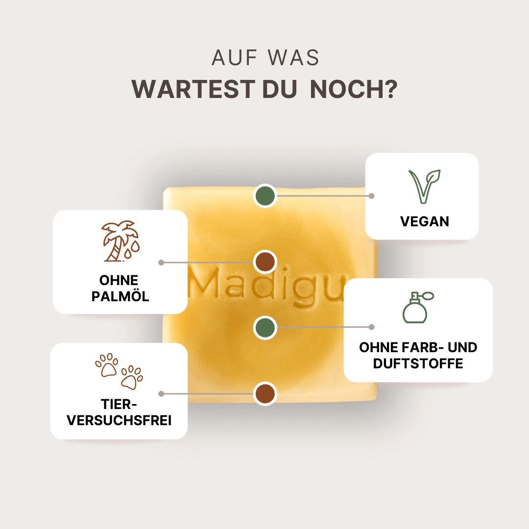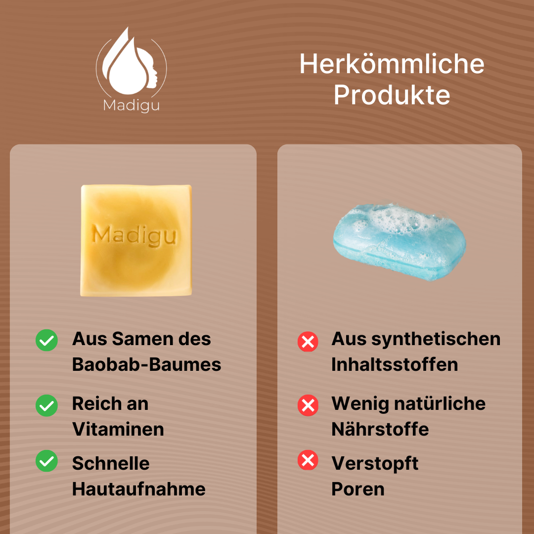 Die handgefertigte Madigu Baobab Hand- und Duschseife in Bio-Qualität auf feuchte Haut auftragen und mit leichten, kreisenden Bewegungen einmassieren. Danach mit lauwarmem Wasser abwaschen. Nach der Reinigung empfehlen wir das Madigu Baobabpflegeöl für das optimale Pflegeerlebnis - für alle Hauttypen geeignet.