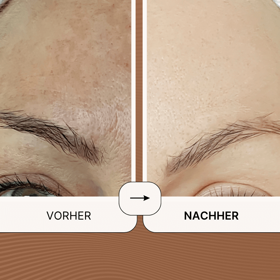 Auf dem Vorher-Bild siehst du müde und gestresste Haut, die von Umwelteinflüssen gezeichnet ist.